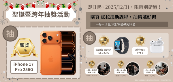 只要在 12 月購課,不只開始變健康,更有機會把 iPhone 17 Pro、Apple Watch、AirPods Pro 3 等 37 個獎項直接帶回家!